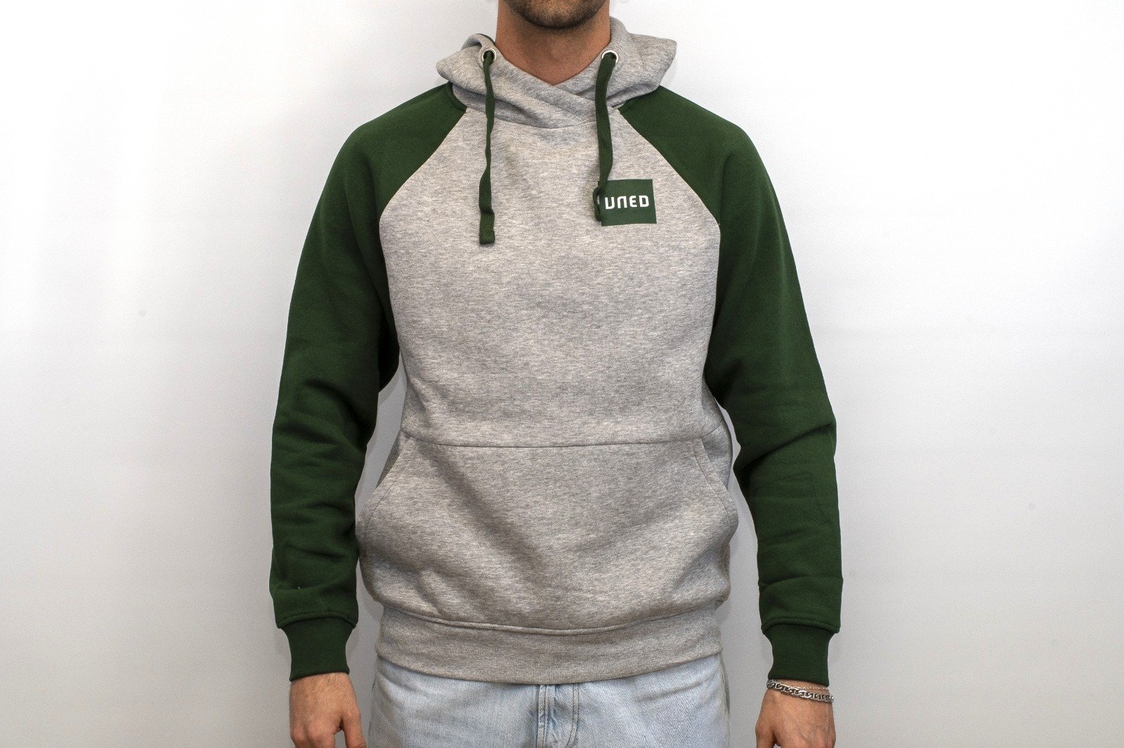 Sudadera unisex bicolor con capucha forrada. Manga ranglán. Puños y cinturilla en canalé 1x1 con elastano. Cubrecosturas del mismo tejido.